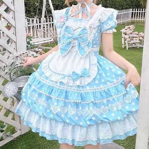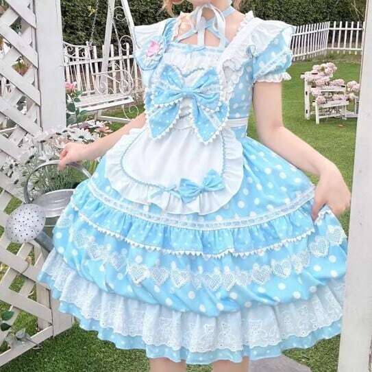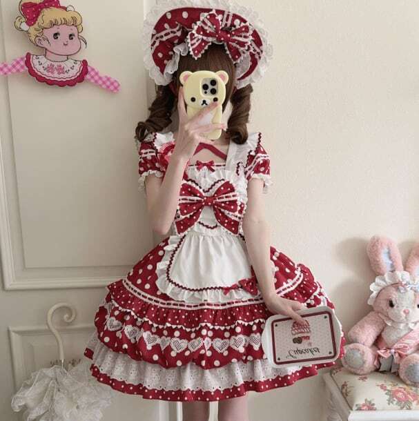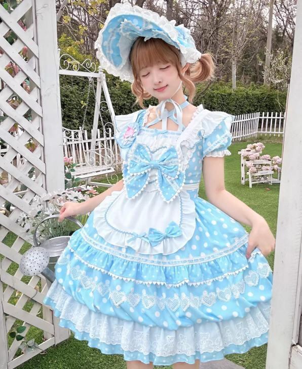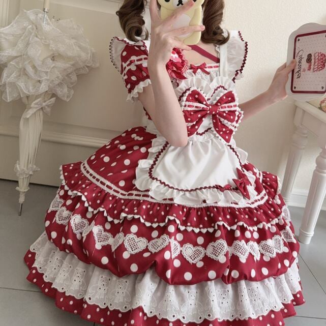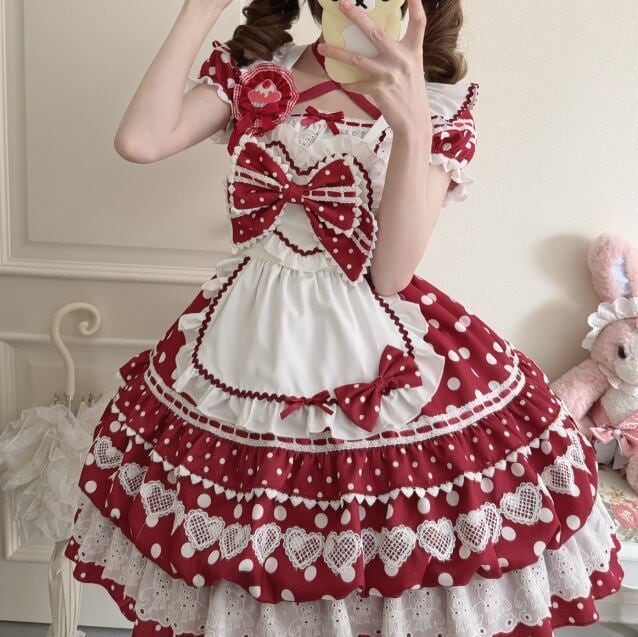 甘ロリ♡全3カラー ドット柄ブローチ付きメイド服セット wanpi107★